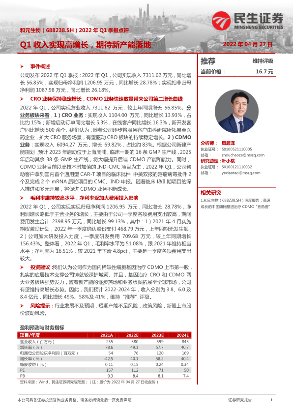 本报告分析了和元生物(688238.SH)2022年第一季度报告,指出公司 CRO 业务保持稳定增长,CDMO 业务快速放量,共同驱动公司业绩增长。