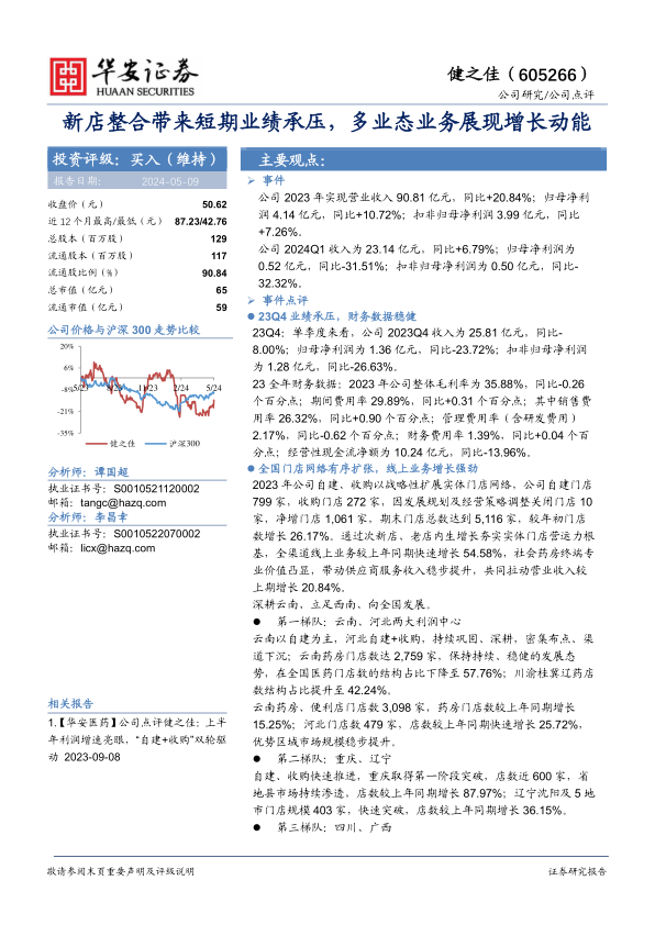 本报告分析了健之佳(605266)2023年及2024年一季度的财务业绩和经营情况,并对其未来发展前景进行了展望。
