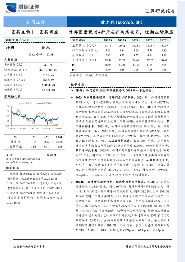 健之佳公司在2023年实现了营收的稳健增长和门店的快速扩张,尤其在省外市场取得了显著进展。然而,受医保政策调整、宏观经济影响以及新开并购门店带来的费用压力,公司在2023年利润增速放缓,并在2024年第一季度出现利润下滑。尽管短期业绩承压,但分析认为,公司通过持续的门店网络扩张,尤其是在省外市场的布局,为未来的长期增长奠定了基础。结合对公司未来盈利的预测以及国内外同行业公司的估值水平,财信证券维持对健之佳的“买入”评级,并给出了相应的目标价格区间,提示投资者关注行业政策、市场竞争及医药电商冲击等潜在风险。