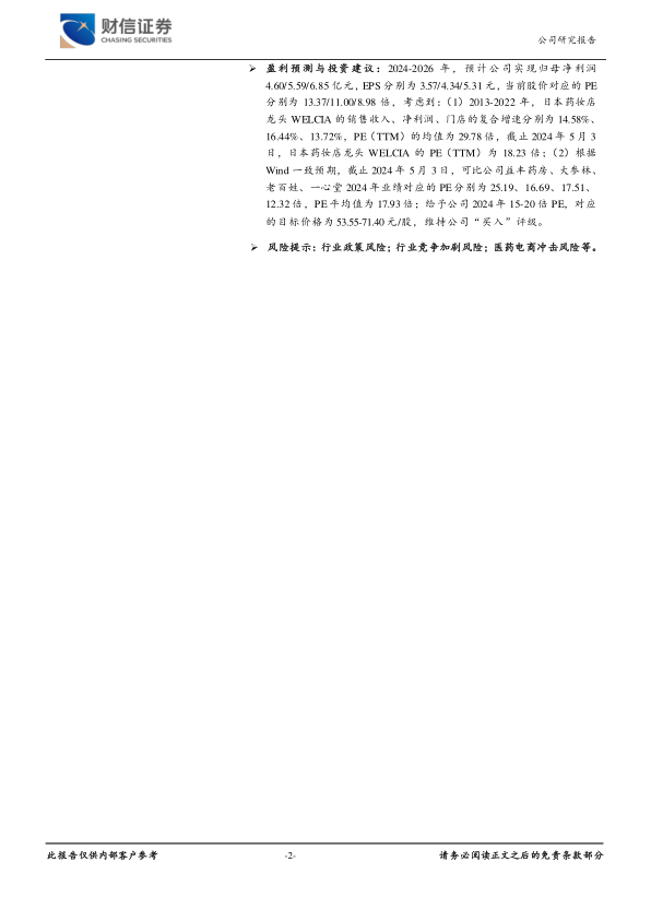 盈利预测与投资建议:2024-2026年,预计公司实现归母净利润4.60/5.59/6.85亿元,EPS分别为3.57/4.34/5.31元,当前股价对应的PE分别为13.37/11.00/8.98倍,考虑到:(1)2013-2022年,日本药妆店龙头WELCIA的销售收入、净利润、门店的复合增速分别为14.58%、16.44%、13.72%,PE(TTM)的均值为29.78倍,截止2024年5月3日,日本药妆店龙头WELCIA的PE(TTM)为18.23倍;(2)根据Wind一致预期,截止2024年5月3日,可比公司益丰药房、大参林、老百姓、一心堂2024年业绩对应的PE分别为25.19、16.69、17.51、12.32倍,PE平均值为17.93倍;给予公司2024年15-20倍PE,对应的目标价格为53.55-71.40元/股,维持公司“买入”评级。