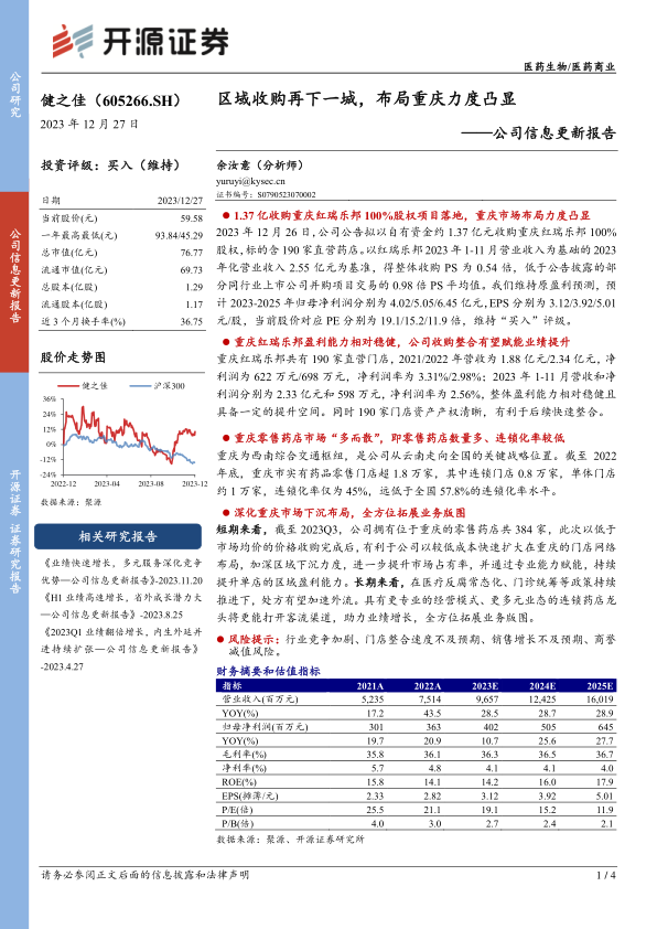 1.37亿收购重庆红瑞乐邦100%股权项目落地,重庆市场布局力度凸显2023年12月26日,公司公告拟以自有资金约1.37亿元收购重庆红瑞乐邦100%股权,标的含190家直营药店。以红瑞乐邦2023年1-11月营业收入为基础的2023年化营业收入2.55亿元为基准,得整体收购PS为0.54倍,低于公告披露的部分同行业上市公司并购项目交易的0.98倍PS平均值。我们维持原盈利预测,预计2023-2025年归母净利润分别为4.02/5.05/6.45亿元,EPS分别为3.12/3.92/5.01元/股,当前股价对应PE分别为19.1/15.2/11.9倍,维持“买入”评级。