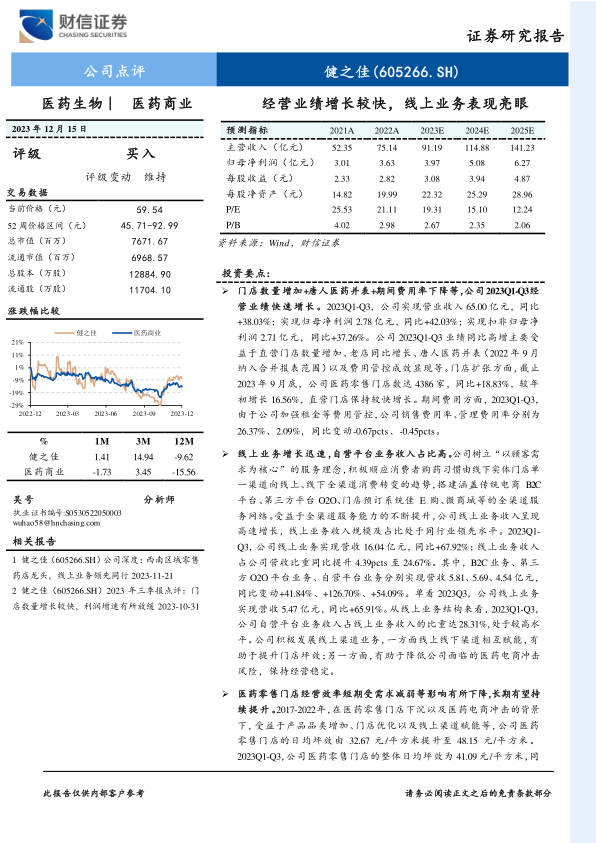 健之佳在2023年前三季度实现了显著的业绩增长,这主要得益于其积极的门店扩张策略、成功的并购整合以及有效的成本控制。公司在全渠道布局,特别是线上业务方面表现突出,线上收入占比和增速均处于行业领先地位,有效增强了市场适应性和抗风险能力。尽管短期内门店经营效率受到外部因素影响有所下降,但公司通过优化产品结构和提升服务能力,长期经营效率有望持续改善。基于对公司未来盈利能力的预测和与国内外同行业公司的估值对比,健之佳展现出良好的投资价值,分析师维持“买入”评级,并提示了行业政策、市场竞争和电商冲击等潜在风险。