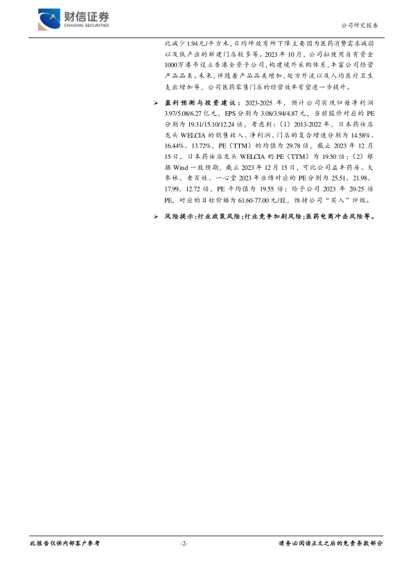 盈利预测与投资建议:2023-2025年,预计公司实现归母净利润3.97/5.08/6.27亿元,EPS分别为3.08/3.94/4.87元,当前股价对应的PE分别为19.31/15.10/12.24倍,考虑到:(1)2013-2022年,日本药妆店龙头WELCIA的销售收入、净利润、门店的复合增速分别为14.58%、16.44%、13.72%,PE(TTM)的均值为29.78倍,截止2023年12月15日,日本药妆店龙头WELCIA的PE(TTM)为19.50倍;(2)根据Wind一致预期,截止2023年12月15日,可比公司益丰药房、大参林、老百姓、一心堂2023年业绩对应的PE分别为25.51、21.98、17.99、12.72倍,PE平均值为19.55倍;给予公司2023年20-25倍PE,对应的目标价格为61.60-77.00元/股,维持公司“买入”评级。