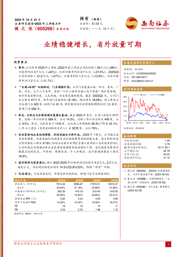 “自建+收购”双轮驱动,门店稳健扩张。公司门店覆盖云南、四川、重庆、广西、河北、辽宁六个省市。坚持“以中心城市为核心向下渗透”的扩张策略,初步形成深耕云南、立足西南,向全国发展的格局。截至2023Q3末,公司门店总数为4711家,较年初门店数增长16.18%,同比增长18.28%。前三季度公司自建门店603家,收购门店61家,因发展规划及经营策略调整关闭门店8家,净增门店656家。