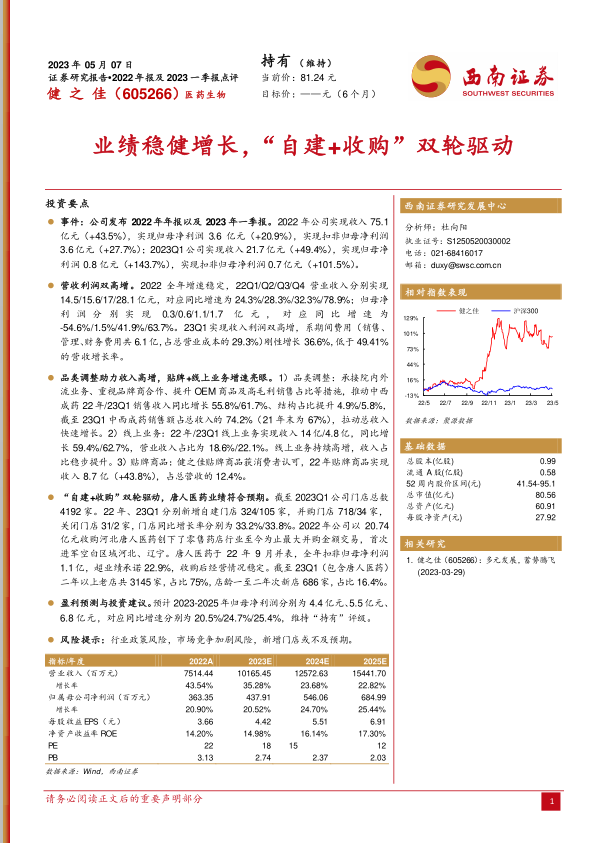 本报告对健之佳(605266)2022年年报及2023年一季报进行了深入分析,核心观点如下: