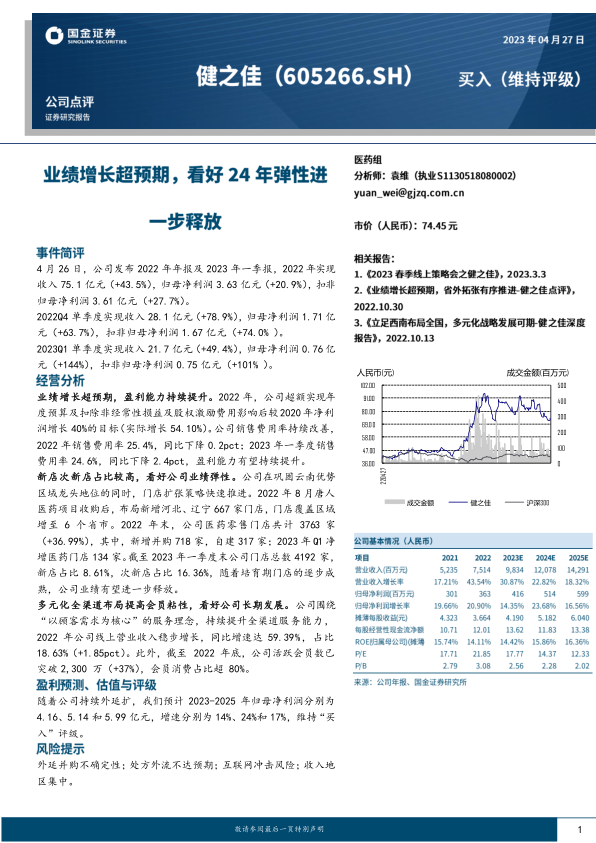 本报告分析了公司2022年年报及2023年一季报,指出公司业绩增长超预期,盈利能力持续提升,门店扩张策略快速推进,多元化全渠道布局提高会员粘性。公司在巩固云南优势区域龙头地位的同时,积极拓展新市场,新店和次新店的逐步成熟将进一步释放业绩。维持“买入”评级,但需关注外延并购不确定性、处方外流不达预期、互联网冲击风险以及收入地区集中等风险因素。