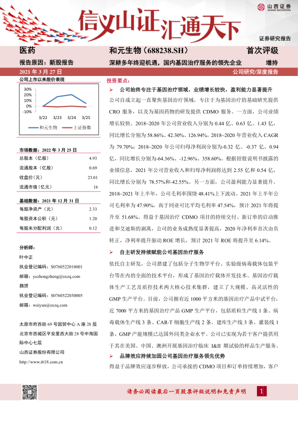 投资建议: 我们预测公司 2021~2023 年营业收入分别为 2.54、 3.59、 6.36亿元,增速分别为 78.25%、 40.95%、 77.40%,归母净利润分别为 0.49、 0.77、1.35 亿元,增速分别为-47.85%、 56.07%、 75.01%,对应 EPS 分别为 0.13、0.16、 0.27 元,以 3 月 25 日收盘价 23.01 元计算,对应 PE 分别为 177.00X、143.81X、 85.22X。考虑到 1)基因治疗行业步入快速发展阶段,公司所处的基因治疗 CRO 和 CDMO 赛道发展前景较好; 2)公司在基因治疗 CDMO领域具有先发优势,铸就了较高的技术壁垒,形成了一定的品牌效应,加之客户粘性较强,具备持续获取新订单的能力; 3)随着和元智造精准医疗产业基地建设项目建设实施,公司的 GMP 生产线得以扩充,产业化能力进一步增强,为未来业绩增长提供保障;对公司首次覆盖,给予公司“增持”的评级。