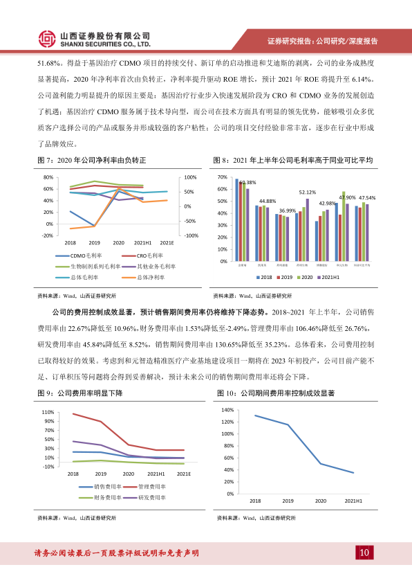 公司自成立起一直聚焦基因治疗领域,专注于为基因治疗的基础研究提供CRO 服务,以及为基因药物的研发提供 CDMO 服务。 一方面,公司业绩增长较快。 2018~2020 年公司营业收入分别为 0.44 亿、 0.63 亿、 1.43 亿,同比增长分别为 58.86%、 42.30%、 126.94%, 2018~2020 年营业收入 CAGR为 79.70%; 2018~2020 年公司归母净利润分别为-0.32 亿、 -0.37 亿、 0.94亿,同比增长分别为-64.36%、 -12.96%、 358.60%。根据招股说明书披露的业绩信息, 2021 年公司营业收入和归母净利润将达到 2.55 亿和 0.54 亿,同比增长分别为 78.57%和-42.55%。 另一方面,公司盈利能力显著提升。2018~2021 年上半年,公司毛利率围绕 48.41%上下波动。 2021 年上半年公司毛利率为 47.90%,高于同业可比平均毛利率 47.54%,预计 2021 年将提升至 51.68%。得益于基因治疗 CDMO 项目的持续交付、新订单的启动推进和艾迪斯的剥离,公司的业务成熟度显著提高, 2020 年净利率首次由负转正,净利率提升驱动 ROE 增长,预计 2021 年 ROE 将提升至 6.14%。