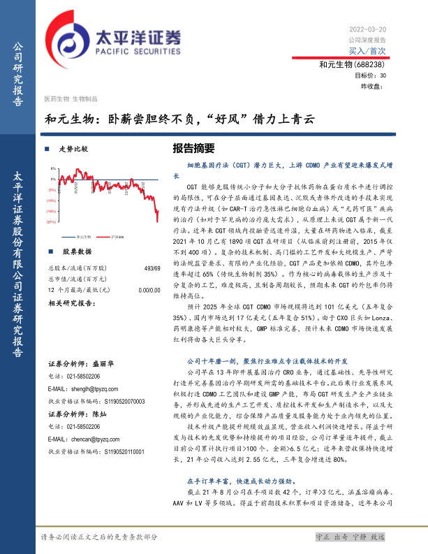 首次覆盖,给与“买入”评级。公司是国内细胞基因治疗CDMO行业先行者,近十年发展打造优质的基因治疗载体开发和生产工艺及质控平台,业务覆盖全面,近年来项目数迅速扩充,在手订单充裕,有望乘行业发展东风实现快速发展。预计公司22/23/24年收入分别为3.52/6.11/9.57亿元、归母净利润为0.85/1.14/2.41亿元,考虑公司22年盈利短暂受产能影响以及所处CGTCDMO行业的高景气度,按照PEG=2给与22年目标PE为130倍,对应目标价为30元,首次覆盖,给与“买入”评级。