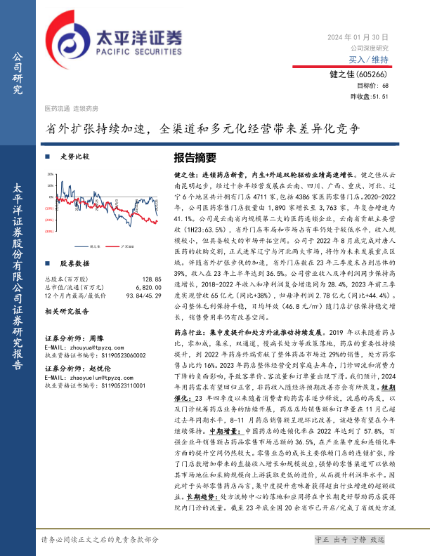 健之佳作为一家快速成长的连锁药店企业,凭借其“自建+并购”双轮驱动的扩张策略,实现了门店规模和经营业绩的显著增长。公司在云南省内建立了稳固的市场地位,并积极向省外拓展,尤其在河北、辽宁、重庆等市场展现出巨大潜力。其差异化的城市布局、高效的坪效管理、领先的全渠道运营能力以及多元化的非药品类经营,共同构筑了其核心竞争优势。在药店行业集中度提升和处方外流的政策红利下,健之佳有望持续受益。尽管面临费用上升等挑战,但随着规模效应的显现和经营效率的提升,公司盈利能力预计将进一步改善。基于其强劲的增长势头和市场潜力,公司被给予“买入”评级,目标价68元/股。