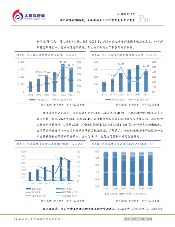 健之佳:连锁药店新贵,内生+外延双轮驱动业绩高速增长。健之佳从云南昆明起步,经过十余年经营发展在云南、四川、广西、重庆、河北、辽宁6个地区共计拥有门店4711家,包括4386家医药零售门店。2020-2022年,公司医药零售门店数量由1,890家增长至3,763家,年复合增速为41.1%。公司是云南省内规模第二大的医药连锁企业,云南省贡献主要营收(1H23:63.5%),省外门店布局和市场占有率仍处于较低水平,收入规模较小,但具备较大的市场开拓空间。公司于2022年8月底完成对唐人医药的收购交割,正式进军辽宁与河北两大市场,将作为未来发展重点区域。伴随省外扩张步伐的加速,省外门店数在23年三季度末占到总体的39%,收入在23年上半年达到36.5%。公司营业收入及净利润同步保持高速增长,2018-2022年收入和净利润复合增速同为28.4%,2023年前三季度实现营收65亿元(同比+38%),归母净利润2.78亿元(同比+44.4%)。公司整体毛利保持平稳,日均坪效(46.8元/㎡)随门店扩张保持稳定增长,销售费用率仍有改善空间。