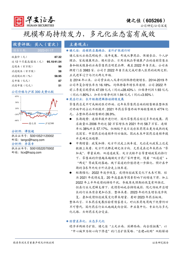当前药店行业正处于有利的发展周期,长期连锁率提升、中期处方外流加速以及短期疫情后恢复增长等多重利好因素叠加。健之佳通过差异化经营策略,如深耕西南下沉市场,以及多元化业态布局,包括“药店+便利店”模式和全渠道营销,有效把握了行业发展机遇。
