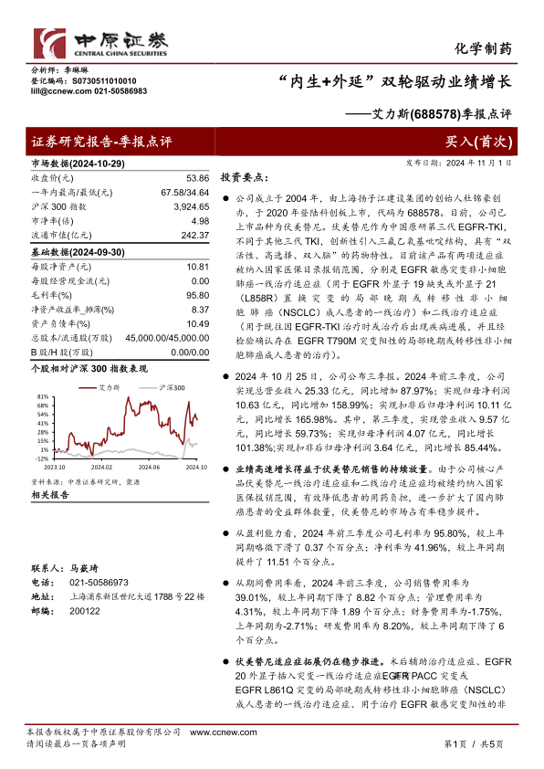 2024年前三季度,艾力斯实现了总营业收入25.33亿元,同比大幅增长87.97%;归母净利润达到10.63亿元,同比激增158.99%;扣非后归母净利润为10.11亿元,同比增长165.98%。其中,第三季度单季营业收入为9.57亿元,同比增长59.73%;归母净利润4.07亿元,同比增长101.38%;扣非后归母净利润3.64亿元,同比增长85.44%。业绩的高速增长主要得益于伏美替尼一线和二线治疗适应症持续纳入国家医保报销范围,推动了其销售的持续放量和市场占有率的稳步提升。