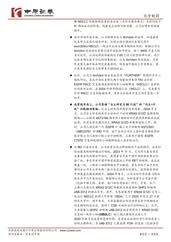 在管线布局上,公司坚持“自主研发与BD引进”的“内生+外延”双轮驱动策略。从自主研发的早期管线布局看,2024年3月,公司自主研发的具有全球知识产权的KRAS G12D选择性抑制剂——注射用AST2169脂质体I期临床研究获得药物临床试验批准,目前全球范围内尚无KRAS G12D抑制剂获批上市。同时,公司已递交新一代EGFR口服小分子抑制剂AST2303(ABK3376)的IND申请,该产品为公司从上海和誉生物医药科技有限公司引进的口服小分子抑制剂,主要用于携带EGFRC797S突变的晚期非小细胞肺癌成人患者的治疗。