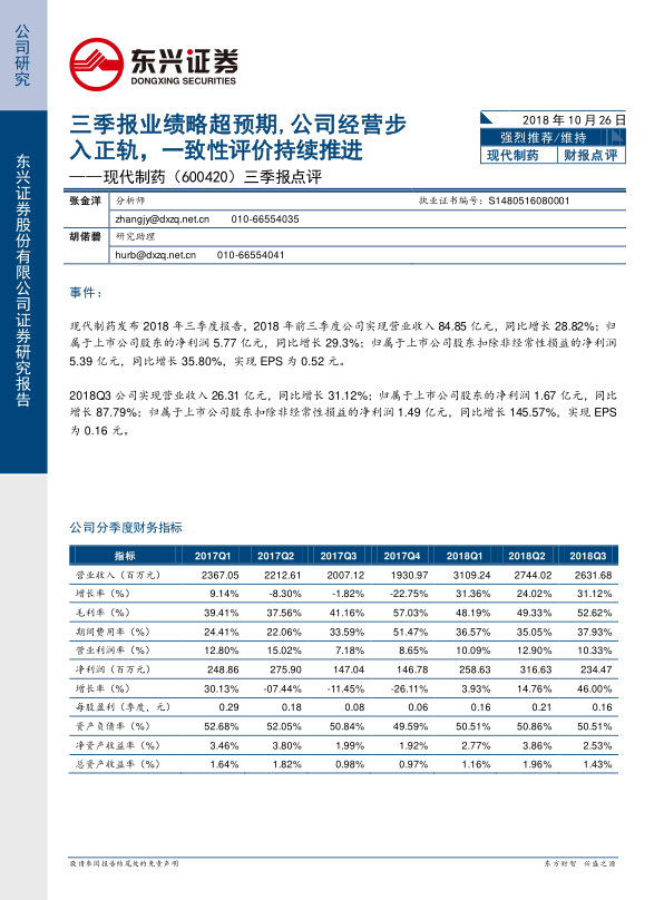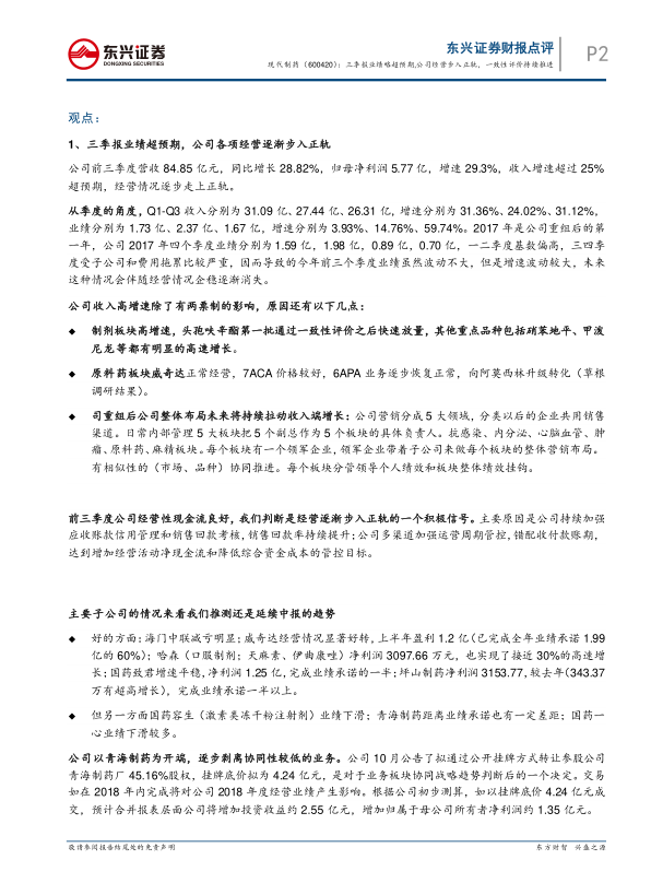 本报告的核心观点是现代制药2018年三季报业绩略超预期,公司各项经营逐渐步入正轨。主要体现在: