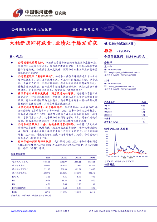 公司正处于快速扩张阶段,上市募资及实控人定增使得资金充裕,为门店扩张提供了有力支持。虽然扩张初期新店投入会暂时影响利润,但随着新店的逐步成熟和业绩放量,公司整体业绩有望迅速提升。报告预测,公司未来三年(2021-2023年)归母净利润将分别达到3.10亿元、4.01亿元和5.21亿元,对应每股收益(EPS)分别为4.46元、5.77元和7.49元,年复合增长率预计将保持在20%以上。鉴于当前较低的估值和即将到来的业绩快速增长,健之佳有望实现估值和业绩的双重提升,即“戴维斯双击”。