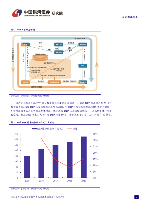 DTP(Direct To Patient)药房作为连接药企和消费者的专业化门店,主要经营抗肿瘤、丙肝、自身免疫系统疾病等新特药,并提供全程药事管理服务。2015年后,DTP药房销售额迅速增长,2019年相比2015年几乎翻倍,但规模仍较小,未来发展空间广阔。国内连锁药店如大参林(89家)、老百姓(143家)、益丰药房(40余家)已积极布局DTP药房。此外,药诊店、国医馆、中药房、专科药店、药妆店等特色药房也通过专业化服务培养客户粘性,是传统药店的转型方向。
