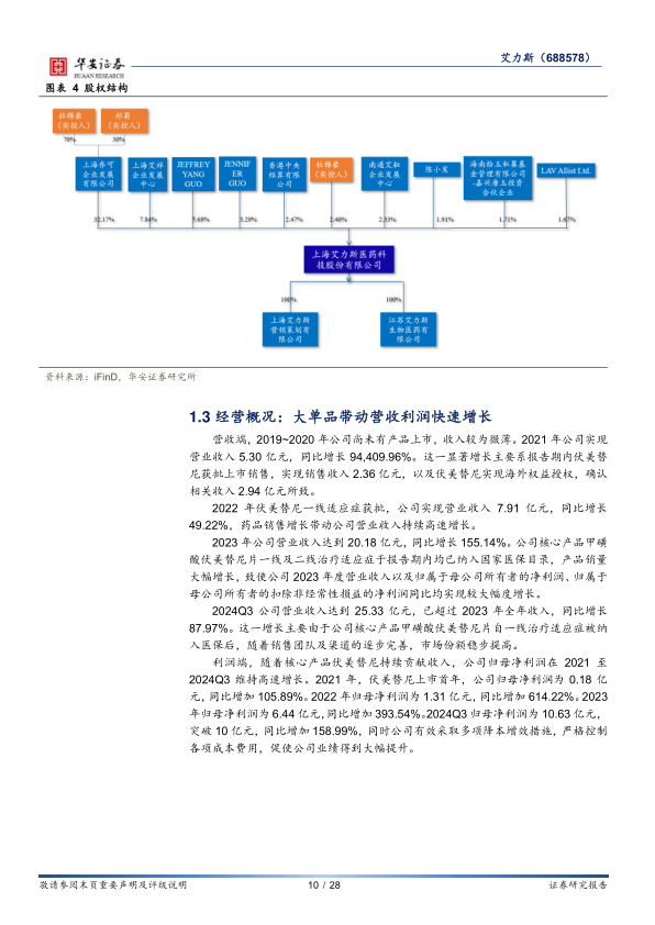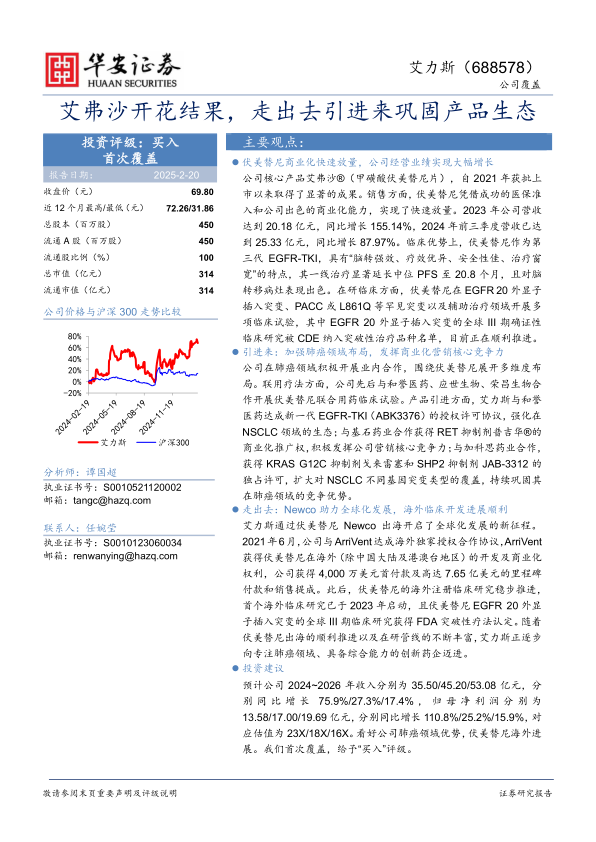 艾力斯成立于2004年,总部位于上海,是一家集研发、生产和营销三位一体的创新型制药企业,专注于肿瘤治疗领域,特别是非小细胞肺癌(NSCLC)小分子靶向药。公司以“中国创新关爱全球患者”为发展理念,致力于开发首创药物(First-in-class)和同类最佳药物(Best-in-class)。其核心产品甲磺酸伏美替尼片(艾弗沙®)自2021年获批上市以来,凭借其“脑转强效、疗效优异、安全性佳、治疗窗宽”的特点,以及成功的医保准入和出色的商业化能力,实现了销售额的快速增长。