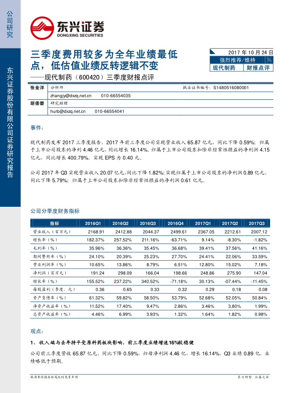 本报告的核心观点是现代制药目前处于低估值状态,但业绩具有反转潜力,有望实现高增长。公司作为国药集团旗下的化药平台,重组完成后经营效率有望持续提升。