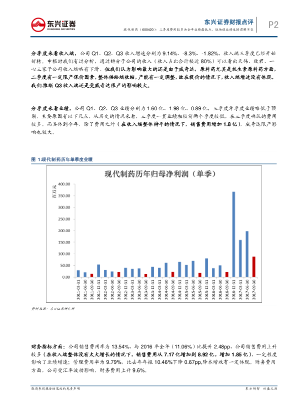 公司销售费用率为13.54%,与2016年全年(11.06%)比提升2.48pp,公司销售费用上升较多(在收入端整体没有太大增长的情况下,销售费用从7.17亿增加到8.92亿,增加1.85亿),一定程度影响了业绩增速;管理费用率为9.79%,比去年年报10.46%下降0.67pp,降本增效有一定体现。
