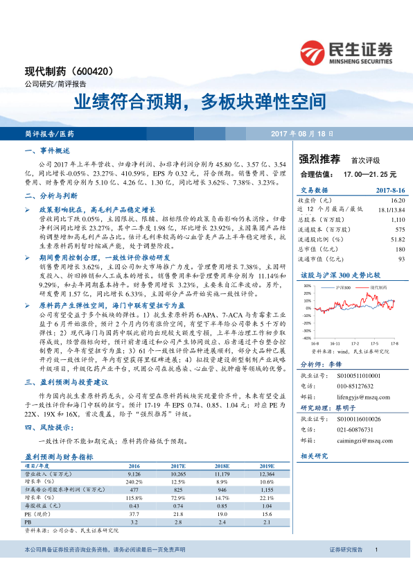 公司有望受益于多个板块的弹性。1)抗生素原料药6-APA、7-ACA与青霉素工业盐于6月开始涨价,预计2个月内仍有涨价空间,有望下半年给公司带来5千万的弹性;2)现代海门与国药中联此前均出现较大额度亏损,上半年治理工作初步取得成效,经营指标向好,预计前者通过和公司产生协同效应、后者通过平台整合控制费用,今年有望扭亏为盈;3)61个一致性评价品种进展顺利,部分大品种已展开疗效一致性评价,年内有望获得里程碑进展;4)拟投资建设新型制剂产业战略升级项目,升级化药产业平台,巩固公司在抗感染、心血管、抗肿瘤等领域的优势。
