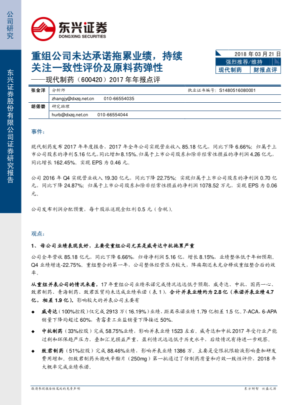 本报告的核心观点在于,现代制药2017年业绩受重组公司未达承诺的拖累,但长期来看,作为国药集团化药工业平台,公司未来增长潜力巨大。具体来说:
