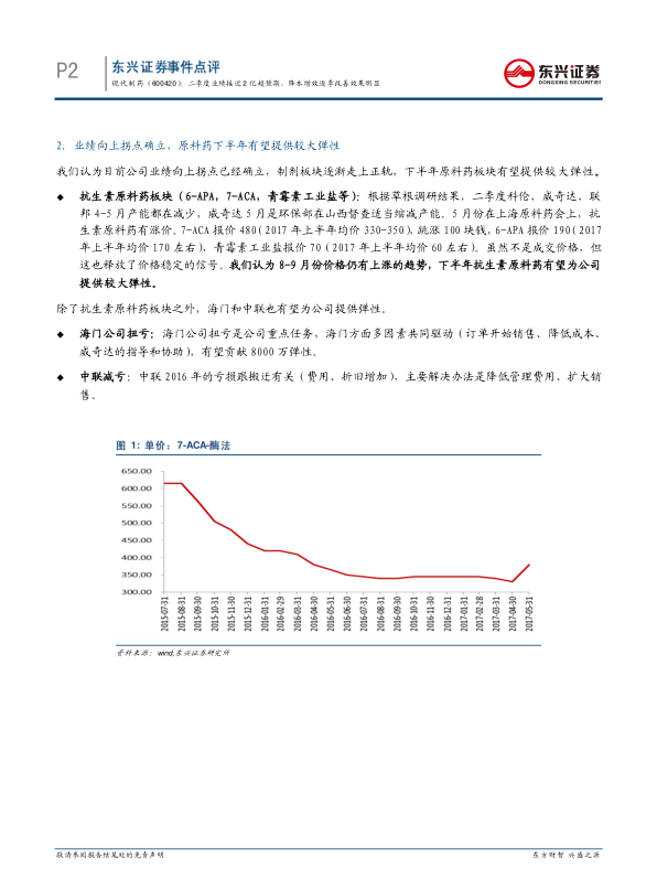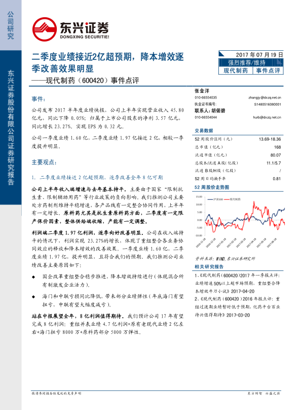 现代制药二季度业绩超预期,降本增效效果明显,业绩向上拐点确立。公司通过国企改革重组整合,优化资源配置,提升经营效率。原料药板块下半年有望提供较大弹性,海门公司有望扭亏,中联有望减亏。公司一致性评价、医保目录调整以及外延预期都将为公司带来增长动力。预计公司未来几年业绩将保持高速增长,维持“强烈推荐”评级。投资者需关注重组整合进度以及相关政策风险。