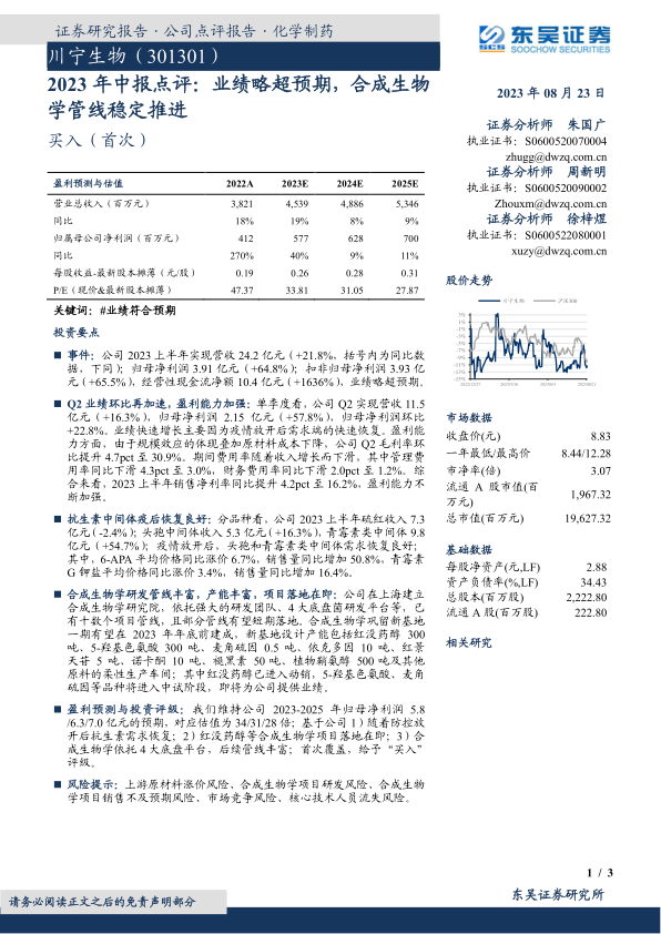 川宁生物2023年中报业绩略超预期,主要得益于疫情放开后需求的快速恢复。报告维持了公司2023-2025年的盈利预测,并首次覆盖给予“买入”评级,看好公司在抗生素中间体需求恢复、合成生物学项目落地以及丰富的研发管线。
