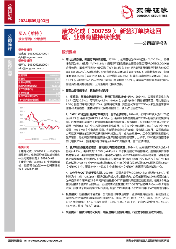 维持康龙化成“买入”评级,预计公司2024-2026年归母净利润分别为17.6、20.5、23.7亿元,EPS分别为0.99、1.15、1.32元,对应PE分别为19.78、16.97、14.74倍。