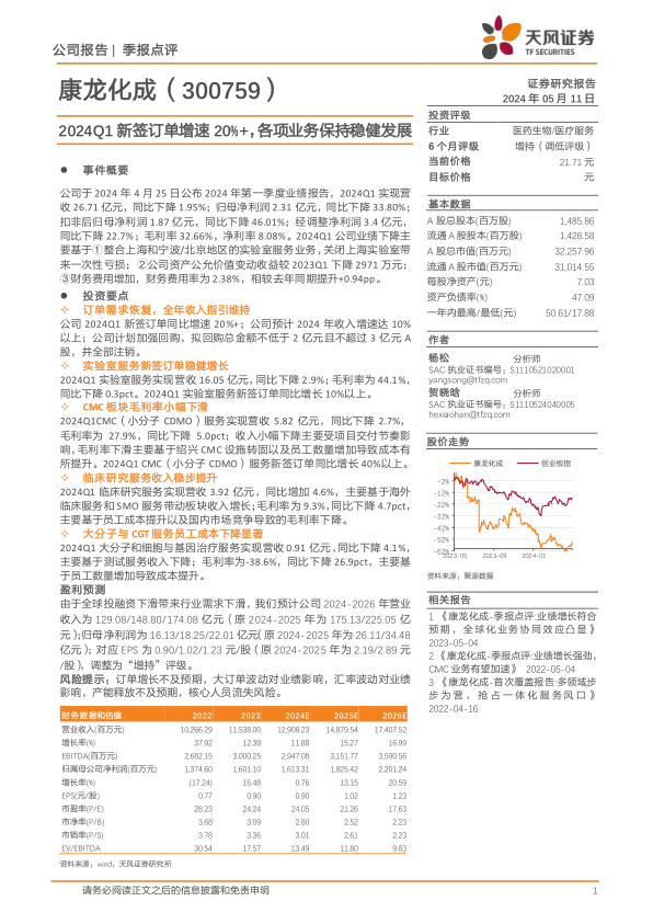 康龙化成2024Q1新签订单同比增长20%以上,公司预计全年收入增速达10%以上,并计划加强回购,拟回购总金额不低于2亿元且不超过3亿元。