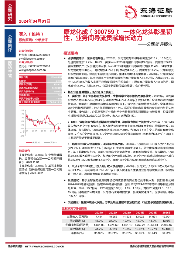 投资建议: 基于全球医药融资端环境仍待改善及新兴业务仍处于投入期,我们调低公司2024-2025年盈利预测,新增2026年盈利预测, 预计公司2024-2026年的归母净利润分别是17.6、 20.6、 23.7亿元, EPS分别是0.99元、 1.15、 1.33元,对应PE分别21.3、 18.3、15.9倍。随着融资环境改善,公司基石业务稳健发展,新业务快速成长,前景可期。维持“买入”评级。