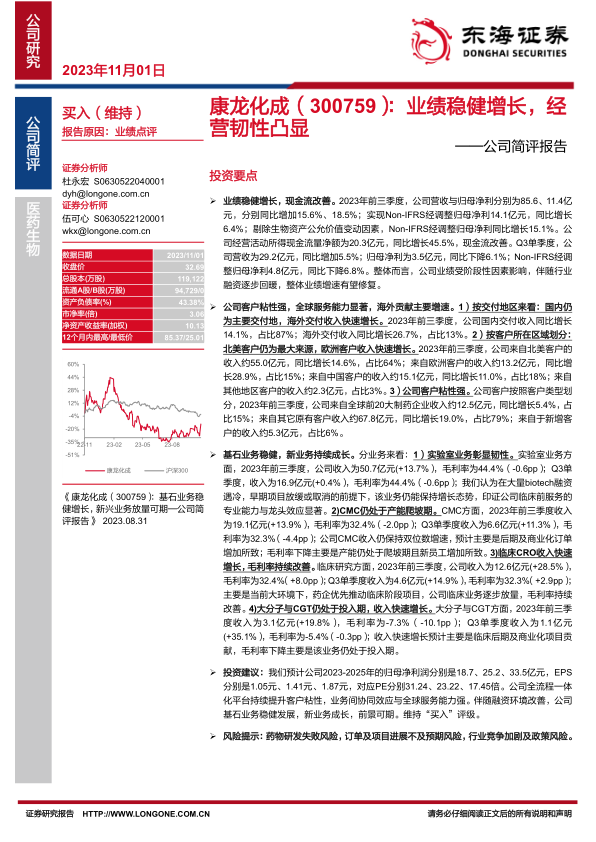 康龙化成2023年前三季度业绩稳健增长,营收和归母净利润均实现同比增长,现金流显著改善。尽管Q3单季度业绩受到阶段性因素影响,但随着行业融资环境的回暖,公司整体业绩增速有望修复。