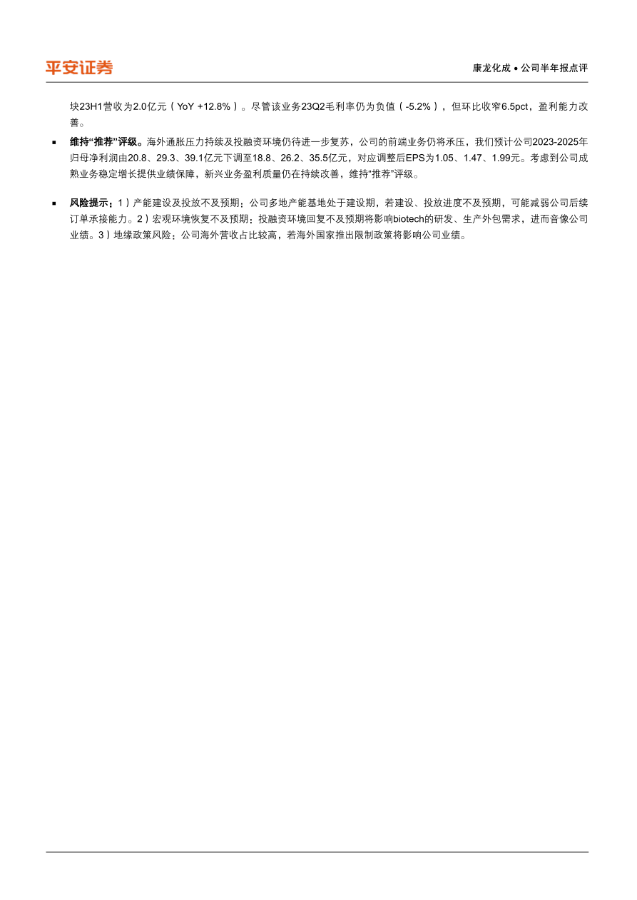 风险提示:1)产能建设及投放不及预期:公司多地产能基地处于建设期,若建设、投放进度不及预期,可能减弱公司后续订单承接能力。2)宏观环境恢复不及预期:投融资环境回复不及预期将影响biotech的研发、生产外包需求,进而音像公司业绩。3)地缘政策风险:公司海外营收占比较高,若海外国家推出限制政策将影响公司业绩。