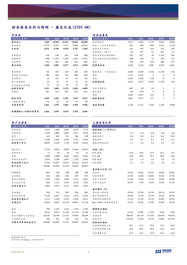 本报告分析了康龙化成2023年上半年的业绩表现,指出公司成熟业务稳健增长,但CMC业务受到外部环境影响。报告维持了对康龙化成港股的“买入”评级和A股的“持有”评级,但下调了盈利预测和目标价,反映了对行业投融资环境和公司业务调整的谨慎态度。总体而言,康龙化成作为CXO龙头企业,长期发展潜力依然值得期待。