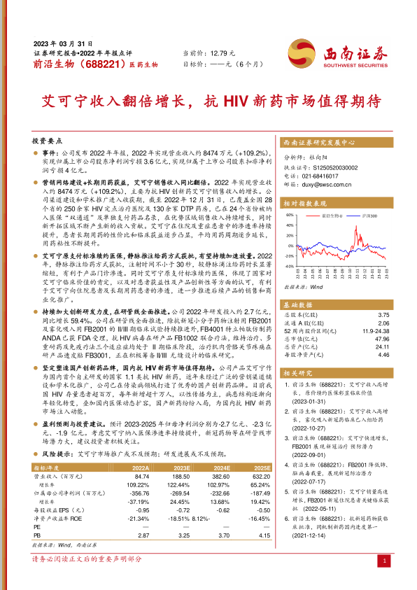 前沿生物2022年年报显示,公司营业收入在核心产品艾可宁的强劲销售带动下实现翻倍增长,达到8474万元。艾可宁通过广泛的渠道覆盖和医保续约,显著提升了市场渗透率和患者粘性。尽管公司目前仍处于亏损状态,2022年归母净利润亏损3.6亿元,但其持续加大的研发投入(2.7亿元,同比增长59.4%)和多元化的创新管线布局,预示着未来的增长潜力。面对国内庞大且不断增长的抗HIV市场需求,艾可宁作为国产创新药的品牌优势,结合医保政策支持,有望推动公司业绩逐步改善,预计未来几年亏损将持续收窄。公司在创新药领域的战略布局和市场拓展,使其在充满活力的医药市场中具备长期发展前景。
