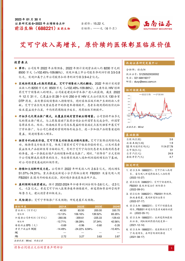 本报告主要分析了前沿生物(688221)2022年的业绩预告,并对其核心产品艾可宁的销售情况、医保续约以及研发进展进行了深入解读。