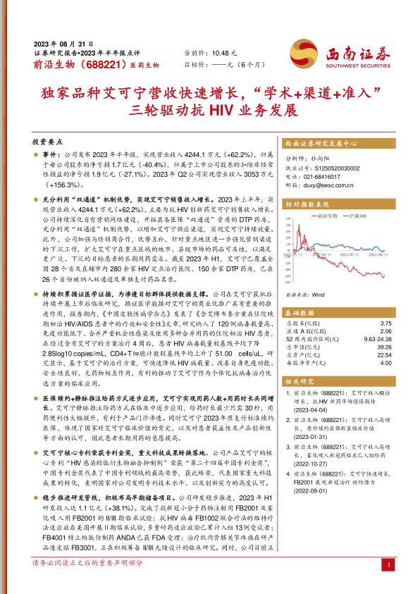 前沿生物2023年半年报显示,公司在抗HIV药物艾可宁的销售方面取得了显著进展,营收快速增长,亏损持续收窄。公司通过拓展销售渠道、积累循证医学证据、提升用药便利性等方式,不断提升艾可宁的市场竞争力。同时,公司也在积极推进研发管线,布局未来发展。尽管公司目前仍处于亏损状态,但考虑到艾可宁的市场潜力以及在研管线的进展,建议投资者积极关注。但同时也需注意市场推广和研发进展不及预期的风险。