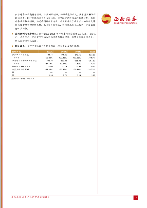 盈利预测与投资建议:预计2023-2025年归母净利润分别为-2.9亿元、-2.6亿元、-2.9亿元。考虑艾可宁纳入医保渗透率持续提升,在研管线市场潜力大,建议投资者积极关注。
