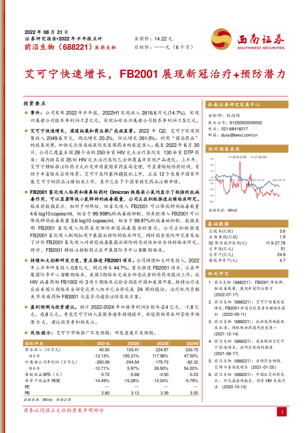 前沿生物在2022年上半年展现出核心产品艾可宁的强劲增长势头,通过深化渠道覆盖和拓展国际市场,其销售收入实现显著提升。同时,公司在新冠治疗药物FB2001的研发上取得了突破性进展,临床前数据表明其在抗病毒和预防新冠感染方面具有巨大潜力,相关临床研究正在积极推进。尽管公司目前仍处于亏损状态,但持续加大的研发投入和多管线创新药物的并行开发,为公司未来的市场竞争力和盈利能力奠定了基础。投资者应关注艾可宁的市场推广进展以及FB2001等创新药物的临床研究成果,同时警惕市场推广和研发进展不及预期的风险。
