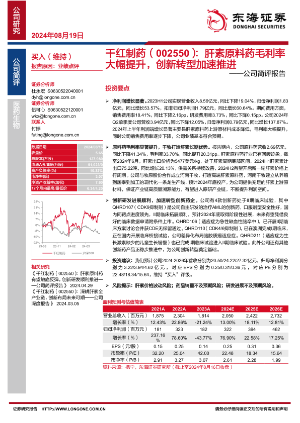 本报告对千红制药(002550)2023年半年度业绩进行了分析,并维持“买入”评级。核心观点如下: