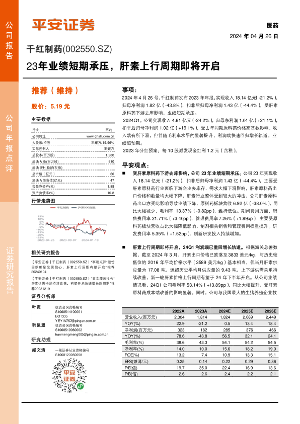 2024年4月26号,千红制药发布2023年年报,实现收入18.14亿元(-21.2%),归母净利润1.82亿(-43.8%),扣非后归母净利润1.43亿(-44.4%),受肝素原料药下游去库影响,业绩短期承压。