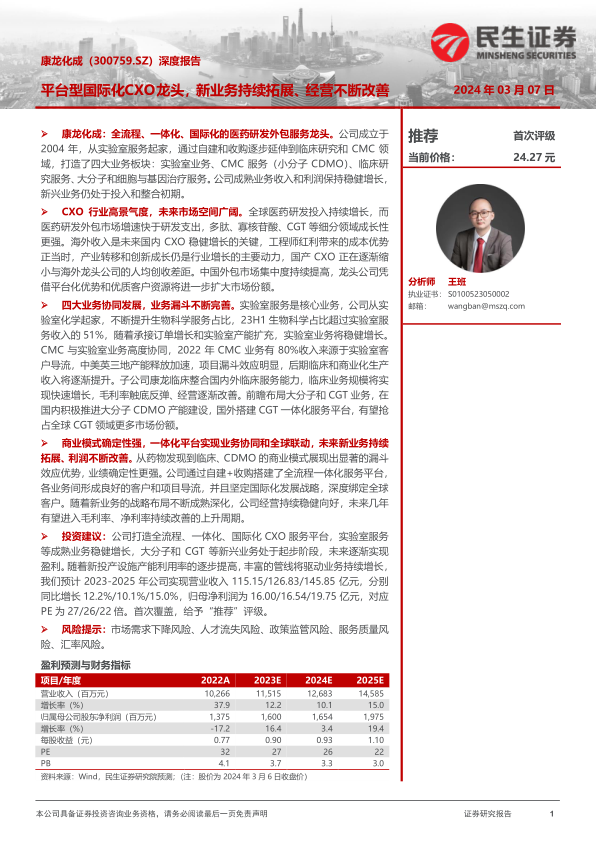 康龙化成作为一家全流程、一体化、国际化的CXO龙头企业,凭借其在实验室服务领域的深厚积累和通过“自建+收购”策略构建的四大业务板块,成功打造了具有显著协同效应的综合服务平台。公司紧抓全球医药研发投入持续增长和外包渗透率不断提升的市场机遇,尤其在多肽、寡核苷酸和CGT等新兴领域展现出强劲的成长潜力。其国际化发展战略和中国工程师红利带来的成本优势,使其在全球CXO市场中占据有利地位,并持续扩大海外市场份额。尽管大分子和CGT等新兴业务尚处于投入期,但随着新产能的逐步释放和业务整合的深化,公司预计将实现稳健的收入增长和持续改善的盈利能力。基于对公司业务模式、市场前景和财务表现的分析,预计2023-2025年营业收入和归母净利润将持续增长,首次覆盖给予“推荐”评级。同时,需关注市场需求下降、人才流失、政策监管、服务质量及汇率波动等潜在风险。