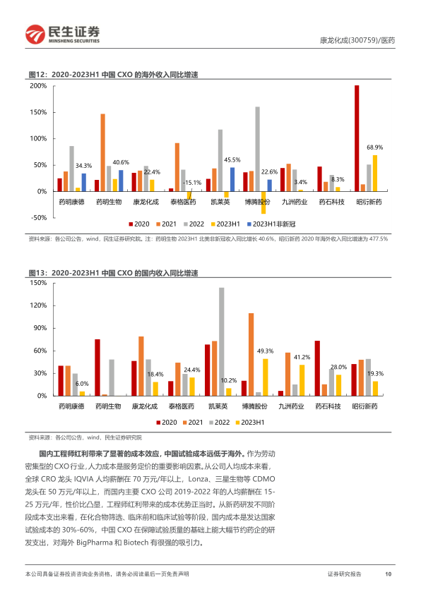 四大业务协同发展,业务漏斗不断完善。实验室服务是核心业务,公司从实验室化学起家,不断提升生物科学服务占比,23H1生物科学占比超过实验室服务收入的51%,随着承接订单增长和实验室产能扩充,实验室业务将稳健增长。CMC与实验室业务高度协同,2022年CMC业务有80%收入来源于实验室客户导流,中美英三地产能释放加速,项目漏斗效应明显,后期临床和商业化生产收入将逐渐提升。子公司康龙临床整合国内外临床服务能力,临床业务规模将实现快速增长,毛利率触底反弹、经营逐渐改善。前瞻布局大分子和CGT业务,在国内积极推进大分子CDMO产能建设,国外搭建CGT一体化服务平台,有望抢占全球CGT领域更多市场份额。