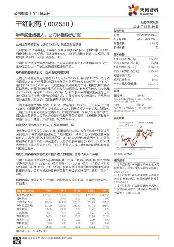 千红制药2019年上半年表现出强劲的增长势头,营收和净利润均实现稳健增长,经营活动现金流显著改善。公司在原料药销售方面持续发力,尤其在国际市场取得了显著进展,国外营收占比近半,显示出其国际化战略的有效性。研发投入稳步增加,多个创新药项目顺利推进,为公司未来发展奠定基础。尽管制剂收入略低于预期导致盈利预测小幅下调,但鉴于公司销售规模的扩大、国外收入的增加以及产品转型升级的战略目标,分析师维持了“买入”评级,并对公司未来发展持乐观态度。