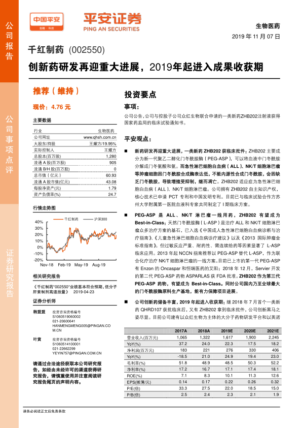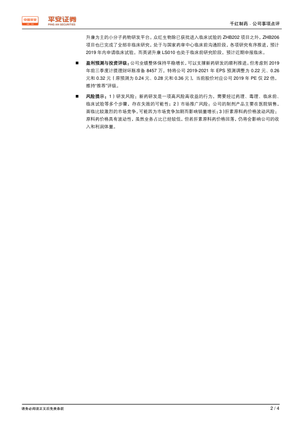 本报告分析了千红制药一类新药ZHB202获临床批件的重大进展,认为公司在创新药研发方面取得了重要突破,并有望进入成果收获期。同时,公司创新药储备丰富,未来发展潜力巨大。报告维持对公司的“推荐”评级,但也提示了研发风险、市场推广风险和肝素原料药价格波动风险。