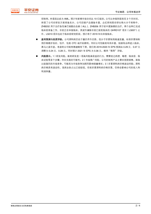 考虑到公司制剂增速略有下滑,报告将2019-2020年EPS预测由0.29元、0.37元调整为0.24元、0.28元,并预计2021年EPS为0.36元,维持对公司的“推荐”评级。