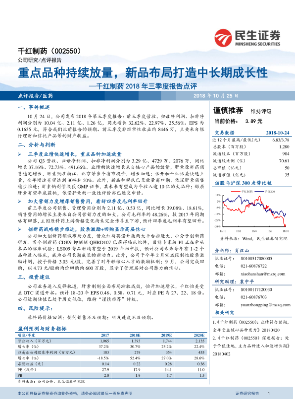 千红制药2018年三季度报告点评:重点品种持续放量,新品布局打造中长期成长性