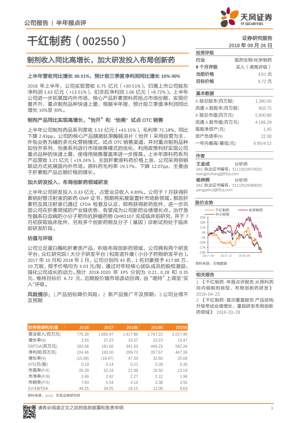 千红制药2018年上半年表现出强劲的增长势头,尤其在制剂产品方面实现了高增长,并通过优化营销模式和拓展OTC渠道,有效提升了市场份额。公司持续加大研发投入,在肝素领域和创新药方面取得了重要进展,多个新药项目获得批件或进入临床阶段,为公司未来发展注入了新动力。股权激励机制的实施也进一步激发了团队活力。尽管面临市场风险,但公司在产品结构升级和创新药布局方面的战略转型,使其具备了良好的长期增长潜力,因此分析师上调了其投资评级至“买入”。