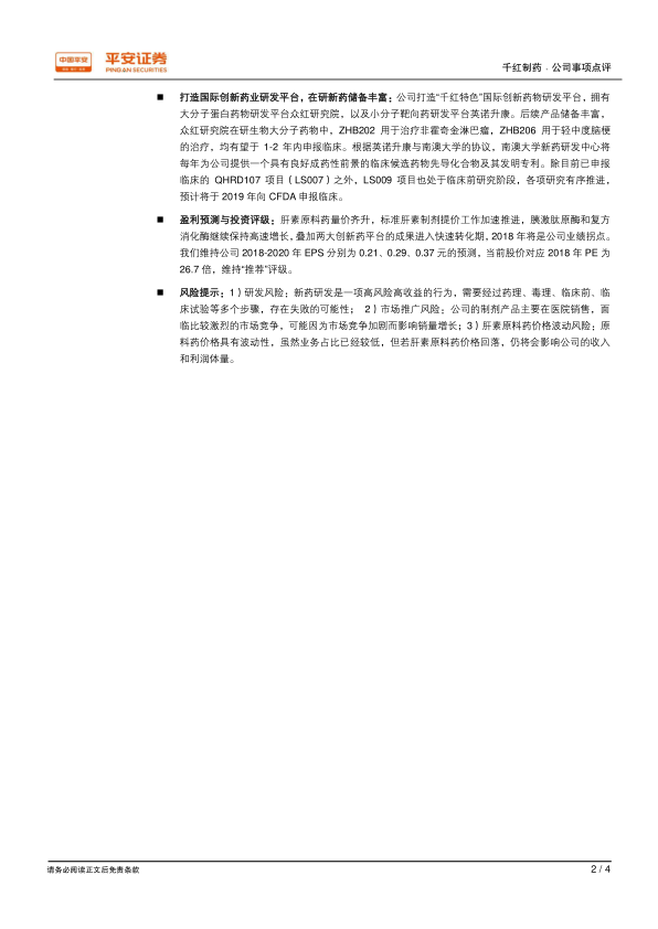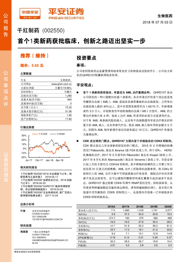 千红制药凭借首个1类新药QHRD107获批临床,在创新药研发领域取得了重要进展。QHRD107作为国内首个CDK9抑制剂,具有广阔的市场前景。公司通过打造国际创新药业研发平台,储备了丰富的在研新药,为未来的业绩增长奠定了基础。维持对公司2018-2020年盈利预测和“推荐”评级,看好公司未来的发展潜力。