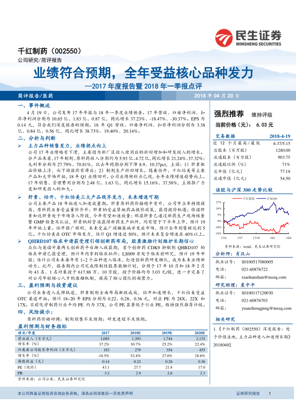 千红制药在经历2017年因新厂区投入和研发增加导致的短期业绩波动后,于2018年第一季度展现出强劲的业绩反弹,营收和净利润均实现高速增长。这主要得益于肝素系列产品、怡开和千红怡美三大核心产品线的市场发力。公司在创新药研发方面也取得积极进展,首个创新药临床申请获受理,并计划持续丰富创新药管线。同时,限制性股票激励计划的实施,进一步巩固了核心团队的稳定性与积极性。鉴于公司业务已进入反弹轨道,核心产品加速放量,且估值显著低于行业平均水平,分析师维持“强烈推荐”评级,但提示需关注原料药价格、制剂销售及研发进展等潜在风险。